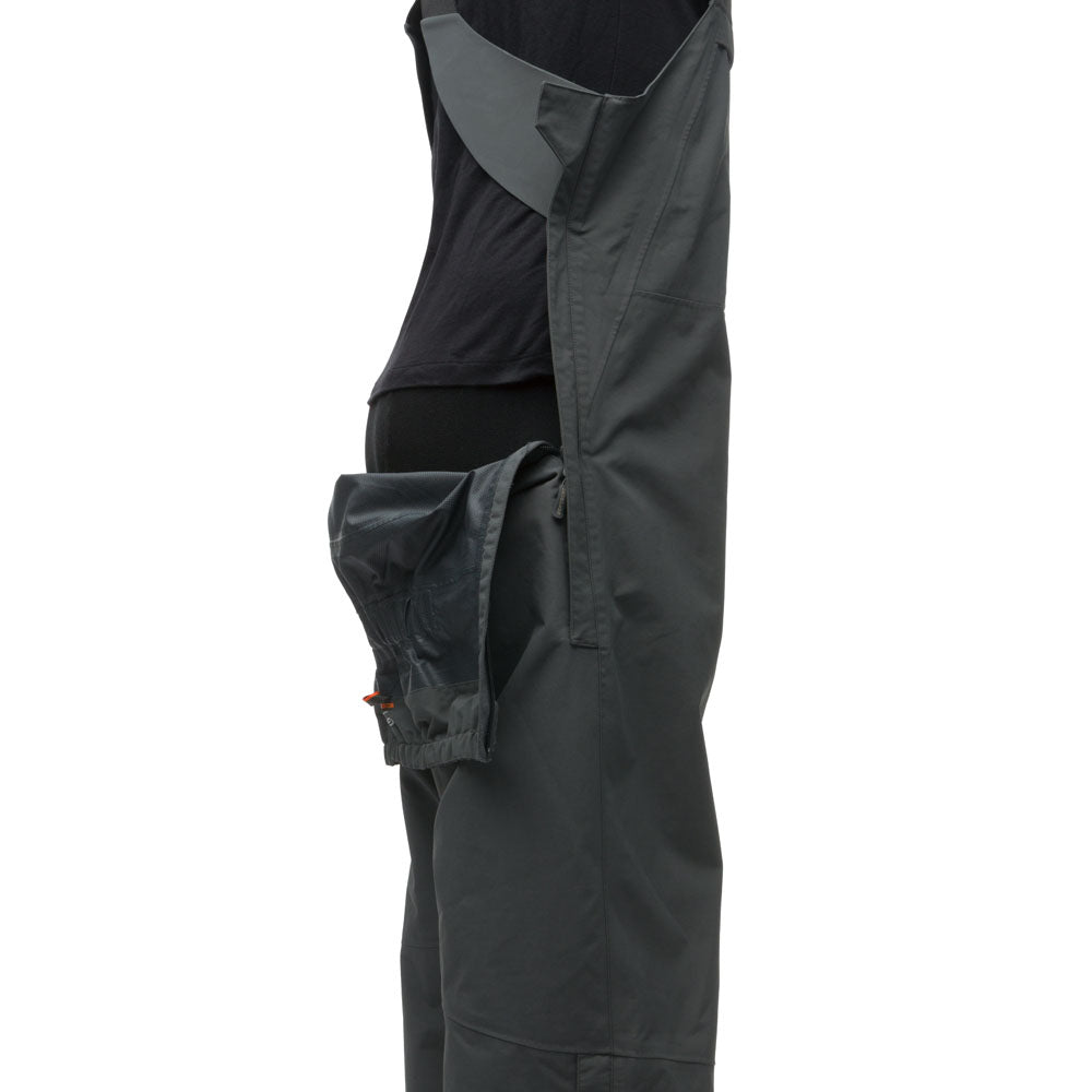 - Relief system is a combined suspender design and zipper full length leg zipper. Suspenders stay in place while the lower bib un-zips and swings away for ease of relief on the boat.