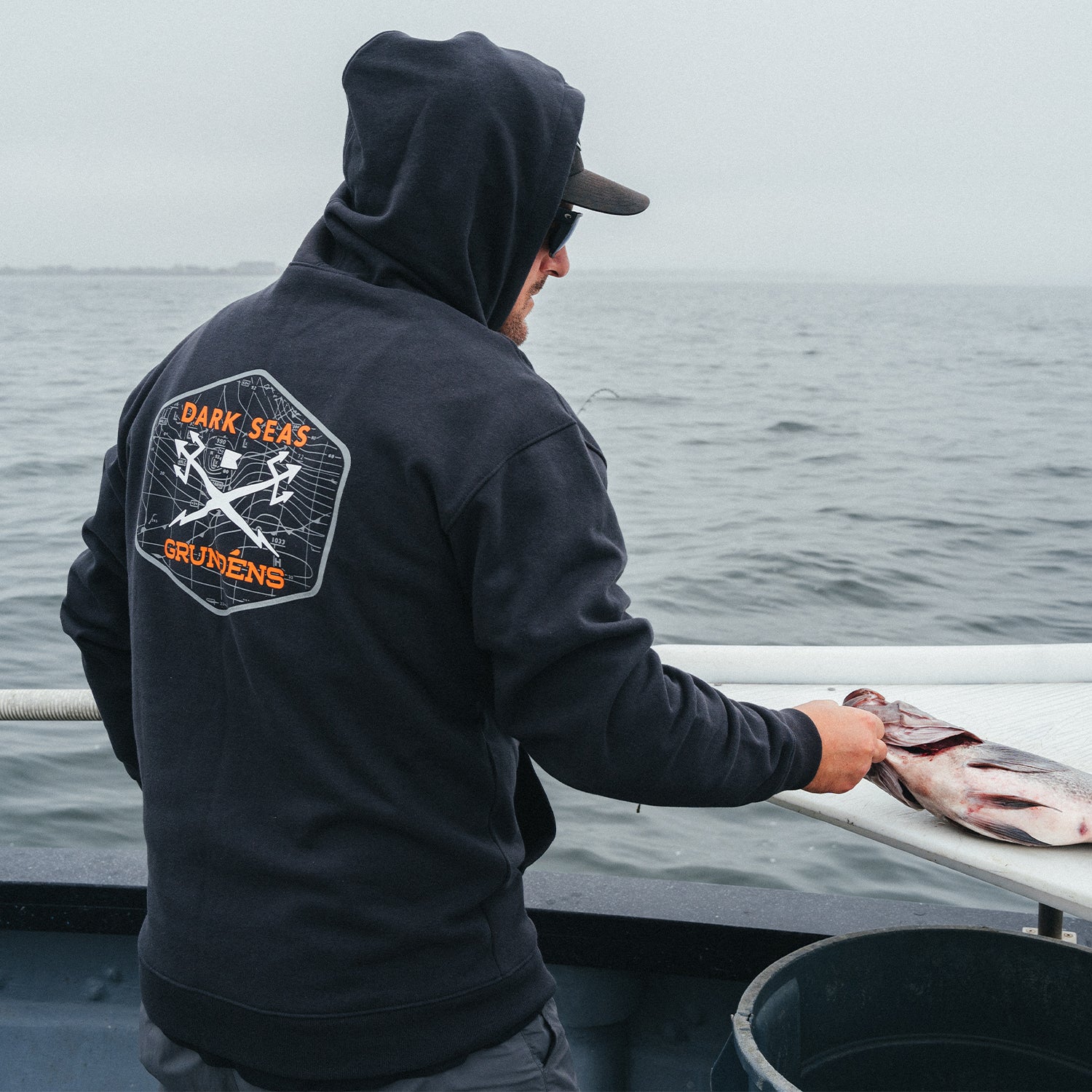 An ultra-comfortable cotton-poly hoodie built to serve your need of exploring the ocean’s depths, spun with a dose of darkness from our comrades at Dark Seas. The Grundéns X Dark Seas collab ventures past the shoreline to create timeless designs inspired by the human spirit’s natural draw to water. Forged by a kinship of the wayward kind, Grundéns X Dark Seas products dive into the depths of mixing seafaring traditions with a wave of disruptiveness, encouraging a new generation of voyagers to explore their own path. Where the compass takes you from here is up to you.