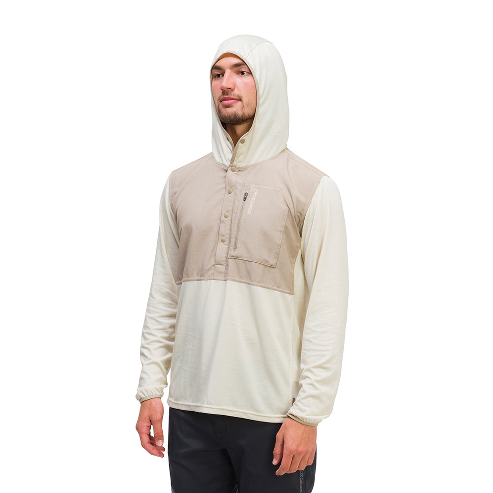A softer side of sun protection. The feel of cotton with the performance of synthetics. Airy, comfortable and quick drying, the main body is a UPF 30 DriRelease® knit blend (85% Poly, 15% Organic Cotton) that dries 4X faster than cotton, plus permanent Freshguard® odor protection. The upper yoke is a woven ripstop 58% Polyester/42% Recycled Polyester for a bit of extra durability when layered under bib straps, with the added benefit of light wind and weather protection. A Scuba style snap-closure hood lets you decide - up or down - depending on the conditions.
