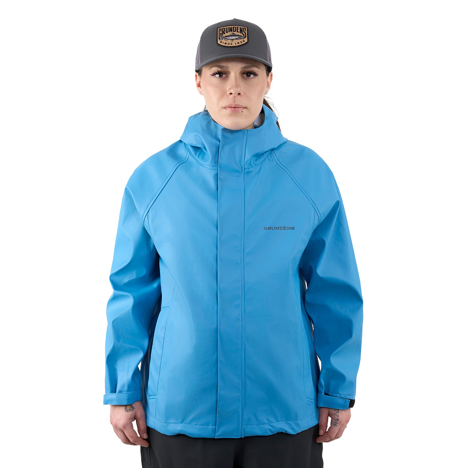 This full-zippered hooded jacket is made from medium-weight polyurethane-coated polyester fabric providing 100% waterproof protection, comfort, and ease of movement active fishermen need. An athletic cut and underarm gussets deliver protection without restricting fishing action.